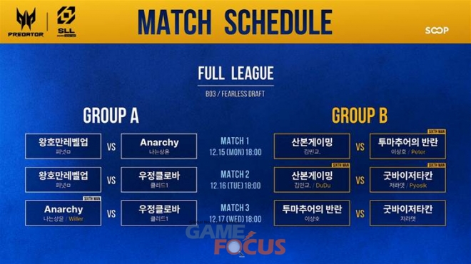 2025 SLL WINTER 본선은 에이서 프레데터가 공식 후원하며, 6강은 3전 2선승제, 4강 및 결승은 5전 3선승제 싱글 토너먼트 방식으로 진행된다. 전 경기에 ‘하드 피어리스 밴픽’ 규칙이 적용돼 챔피언 폭과 전략적 선택 폭이 크게 확장된다. 각 조 1·2위는 19일(금)과 20일(토) 열리는 4강전으로 진출하고, 결승전은 24일(수) 잠실 DN콜로세움에서 오프라인 유관중으로 진행된다.