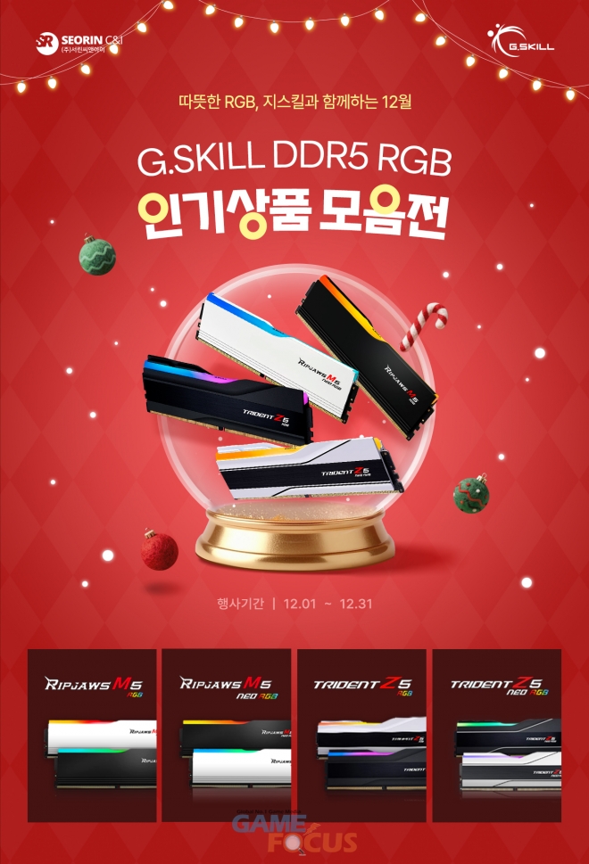 서린씨앤아이(대표: 전덕규)가 IT 전문 쇼핑몰 컴퓨존과 함께 G.SKILL, ESSENCORE KLEVV DDR5 RGB 메모리 인기상품 모음전을 진행한다고 밝혔다. 이번 행사는 2025년 12월 1일부터 12월 31일까지 한 달간 운영되며, RGB 튜닝 수요가 높은 하이엔드 게이밍 PC와 크리에이터용 시스템을 겨냥한 구성으로 마련됐다.