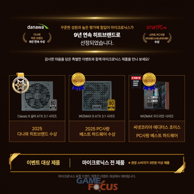이번 수상을 기념해 마이크로닉스는 2025년 12월 18일부터 2026년 1월 31일까지 파워서플라이와 PC 케이스를 중심으로 한 감사 이벤트를 진행한다. 이벤트 대상은 마이크로닉스 전 제품군 중 권장 소비자가 3만 원 이상인 제품으로, 행사 기간 동안 제품을 구매한 소비자는 다양한 혜택에 참여할 수 있다.