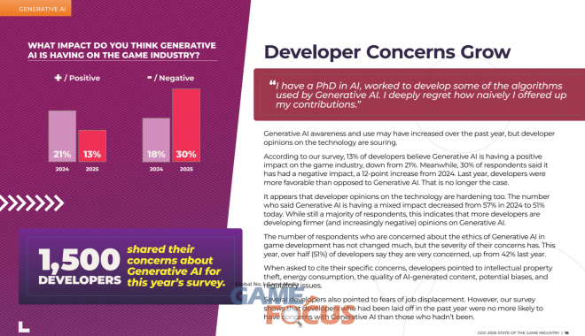올해 진행된 ‘GDC 2025’에서도 생성형 AI를 바라보는 개발자들이 시선이 어떤지 확인할 수 있다. 1500명의 현직 게임 개발자들을 대상으로 한 ‘생성형 AI가 게임 산업에 어떤 영향을 미친다고 생각하는가?’에 대한 설문 조사에서 전체 응답자의 30%가 부정적인 영향을 끼칠 것으로 응답했다. 이는 2024년 13%의 응답 대비 약 2배 이상 많은 수치로 지적 재산권 도용, 에너지 소비, 품질, 정보의 편향성 등이 주 이유였으며 고용 불안에 대한 이슈도 뒤를 이었다.
