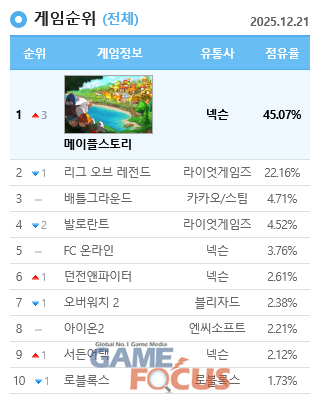 21일 단 하루만 진행된 이번 PC방 이벤트 효과로 '메이플스토리'는 '더 로그' 기준 지난 여름 달성했던 PC방 점유율 25% 기록을 자체 경신하면서 45.07%로 1위를 차지했다. '게임트릭스'에서도 순위와 점유율이 가파르게 상승하면서 3계단 상승한 2위(16.49%)를 기록하며 저력을 과시했다. 신규 캐릭터 '렌'이 추가됐던 '어셈블' 업데이트 효과로 역대 최고 PC방 점유율을 기록한데 이어, 이번 겨울에도 PC방 이벤트 효과로 점유율을 대폭 끌어올린 모습이다.