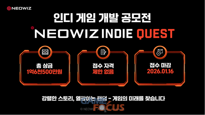 (주)네오위즈(공동대표 김승철, 배태근)는 자사가 진행 중인 내러티브 인디 게임 개발 공모전 ‘네오위즈 인디 퀘스트(NEOWIZ Indie Quest)’의 공식 홈페이지 리뉴얼을 진행했다고 29일 밝혔다.