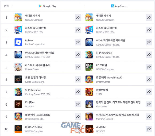 애플 앱스토어에서도 대동소이한 순위 흐름이 이어지고 있다. '메이플 키우기'가 1위 독주를 이어나가는 가운데 '라스트 워: 서바이벌', '화이트아웃 서바이벌', '킹샷', 'FC 모바일'이 TOP 5를 형성하고 있다. '로얄 매치', '운빨존많겜', '전략적 팀 전투', '씨사이드 익스케이프' 등 모바일 기기에서도 손쉽게 즐길 수 있는 게임들이 여전히 높은 매출 순위와 인기 순위를 보이는 가운데, '리니지M'이 10위를 기록했다.