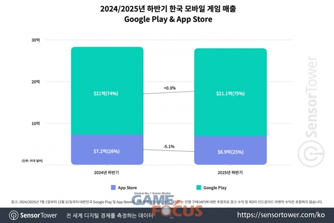 센서타워 시장 규모 데이터에 따르면, 2025년 하반기 한국 모바일게임 시장 매출은 약 28억 달러로 집계되었습니다. 이는 2025년 상반기 대비 8.3% 증가한 수치로 완만한 회복 흐름을 보였다.