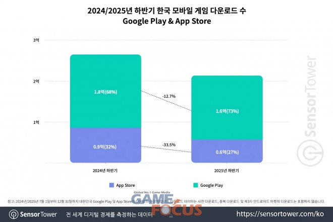 플랫폼별로 보면, 2025년 하반기 안드로이드 매출 기여도는 75%로 전년 동기 74% 대비 확대되었다. 이는 단순한 플랫폼 점유율 변화라기보다, 이후 살펴볼 다운로드 구조 변화와도 흐름상 맞닿아 있는 결과로 해석된다.
