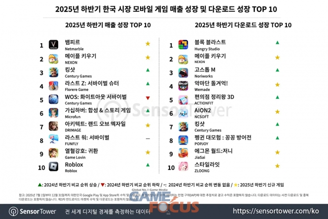 매출 성장 순위에 오른 게임 가운데 가장 오래된 타이틀인 '로블록스'는 2025년 8월 역대 최고 월매출을 경신했다. 10월 5일에는 일일 활성 사용자 수가 역대 최고치를 기록하며, 하반기 모바일게임 기준 일일 활성 사용자 수 1위에 올랐다.