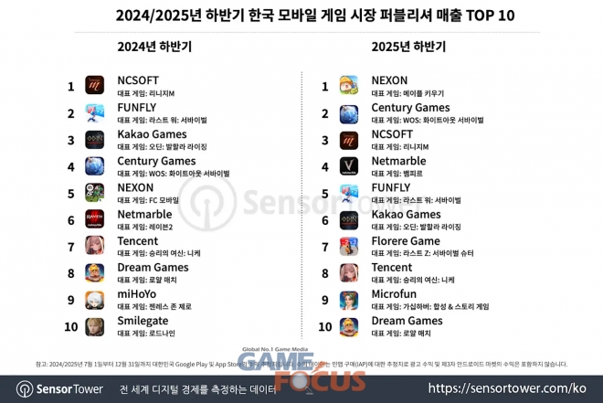 넥슨은 2025년 상반기의 '마비노기 모바일', 하반기 '메이플 키우기'의 성과에 힘입어 국내 모바일게임 퍼블리셔 매출 순위에서 사상 처음으로 1위에 올랐다. 이는 퍼블리셔 단위에서도 시장 구조 변화가 뚜렷해지고 있음을 보여준다.(센서타워가 2014년부터 집계한 상반기, 하반기 퍼블리셔 매출 순위 기준).