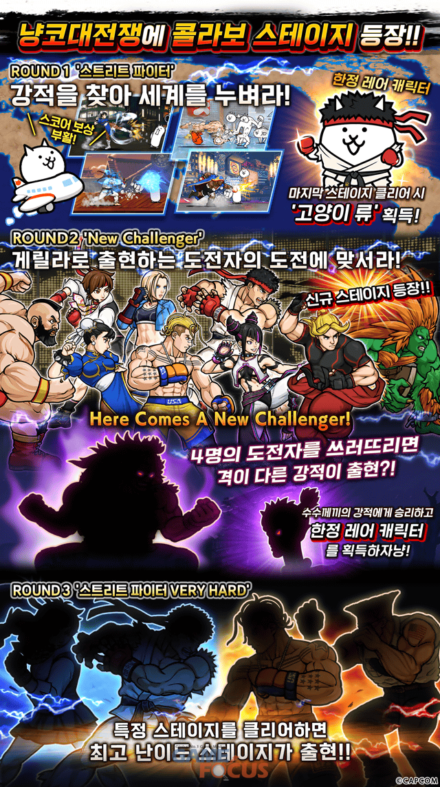콜라보 스테이지 ‘스트리트 파이터’에서는 세계를 누비는 강적들과 대결할 수 있으며 콜라보 스테이지 ‘New Challenger’는 ‘스트리트 파이터’의 캐릭터가 랜덤으로 등장하는 특별 게릴라 스테이지다.