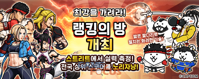 냥코 도장 ‘랭킹의 방’에 ‘스트리트 파이터’의 캐릭터가 적으로 등장하는 기간 한정 콜라보 랭킹 이벤트, ‘나보다 강한 녀석과 만나러 간다’가 개최된다.
