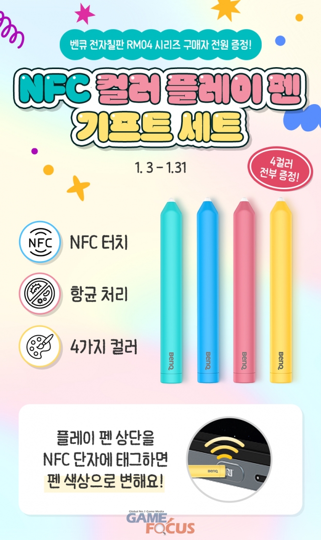 글로벌 디스플레이 전문 브랜드 벤큐(지사장 소윤석)가 인공지능(AI) 기술을 통해 수업의 효율성을 획기적으로 높인 최신형 전자칠판 RM04 시리즈를 대상으로 특별 프로모션을 진행한다. 이번 행사는 1월 3일부터 1월 31일까지 한 달간 진행되며, 벤큐의 마스터 시리즈 전자칠판인 RM04 모델을 구매하는 모든 고객에게 스마트한 수업을 돕는 ‘NFC 컬러 플레이 펜’ 4종 기프트 세트를 증정한다.