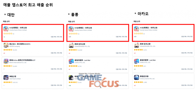그라비티 게임 비전(GGV), ‘RO선경전설: 세계지려’ 대만∙홍콩∙마카오 지역 iOS 1위 달성