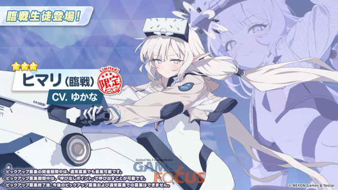 게임 내 최신 정보 공개 코너의 하이라이트인 신규 학생들은 많은 이용자들의 예상대로 6차 PV에 등장했던 '밀레니엄 사이언스 스쿨'의 학생들로 채워졌다. '리오(무장)', '히마리(무장)'은 기간 한정으로 모집할 수 있으며, '토키(무장)'는 1성 학생으로 배포된다.
