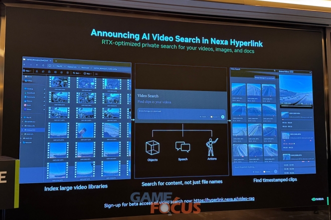 더불어 엔비디아는 소프트웨어, 드라이버 측면에서 AI PC 퍼포먼스 향상을 위해 노력하고 있다. 이와 관련해서는 비디오 생성 최적화, RTX 가속을 통해 문서나 이미지는 물론 비디오의 내용까지 검색할 수 있는 넥사 AI의 검색 툴 '하이퍼링크' 등이 소개됐다. 이중에서도 하이퍼링크는 이미 베타 버전이 출시되어 있어 직접 사용해볼 수 있다.
