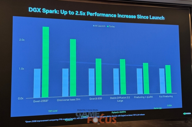 'DGX 스파크'는 작은 폼팩터와 전력 효율성을 갖췄으며 사전 설치된 엔비디아 AI 소프트웨어 스택을 통해 최신 AI 모델의 프로토타이핑, 파인튜닝, 추론을 로컬 환경에서 수행할 수 있다. 발표된 이후 관련 생태계가 빠르게 확장되고 있으며, 최근 업데이트를 통해 최대 2.5배의 성능 향상 효과가 있었다는 설명이다.