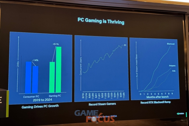 옌 디렉터는 "최근 5년간 전체 PC 출하량은 14% 감소했지만 게이밍 PC 시장은 50% 이상 급성장했다. 이는 뛰어난 완성도의 게임들이 새로이 출시되고 여러 기술적 혁신이 있었기에 가능했다"고 설명했다. '스팀' 플랫폼은 유저 수가 5년 동안 2배 가량 성장해 동시 접속자가 4100만 명에 달하는 것으로 알려져 있다. 더불어 엔비디아는 하드웨어, 소프트웨어 측면에서 혁신을 이어 나가고 있는데, 특히 '블랙웰'이 지난해 론칭하면서 SDK가 3배 증가하기도 했다.