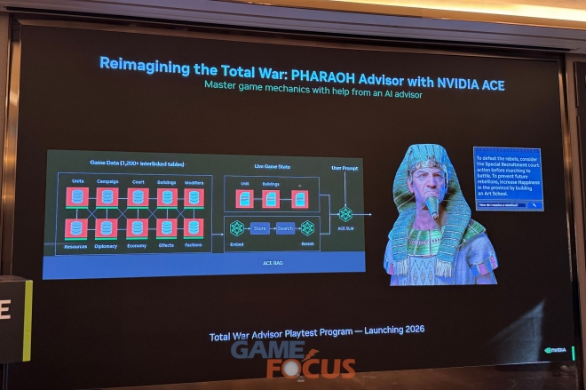 엔비디아는 2023년 생성 AI를 통해 게임 캐릭터에 생명을 불어넣는 기술 '엔비디아 ACE'를 공개한 바 있으며, 오늘 현장에서는 '토탈 워' 시리즈의 '파라오'가 예시로 소개됐다. '토탈 워' 시리즈의 개발사 크리에이티브 어셈블리는 플레이 테스트를 통해 엔비디아 ACE를 활용하고 쌍방향 소통이 가능한 방안을 연구하고 있다. 이 어드바이저는 단순히 미리 준비되어 있는 튜토리얼이나 퀘스트, 가이드가 아니며 보다 상호작용성이 높아진 것이 특징이다.