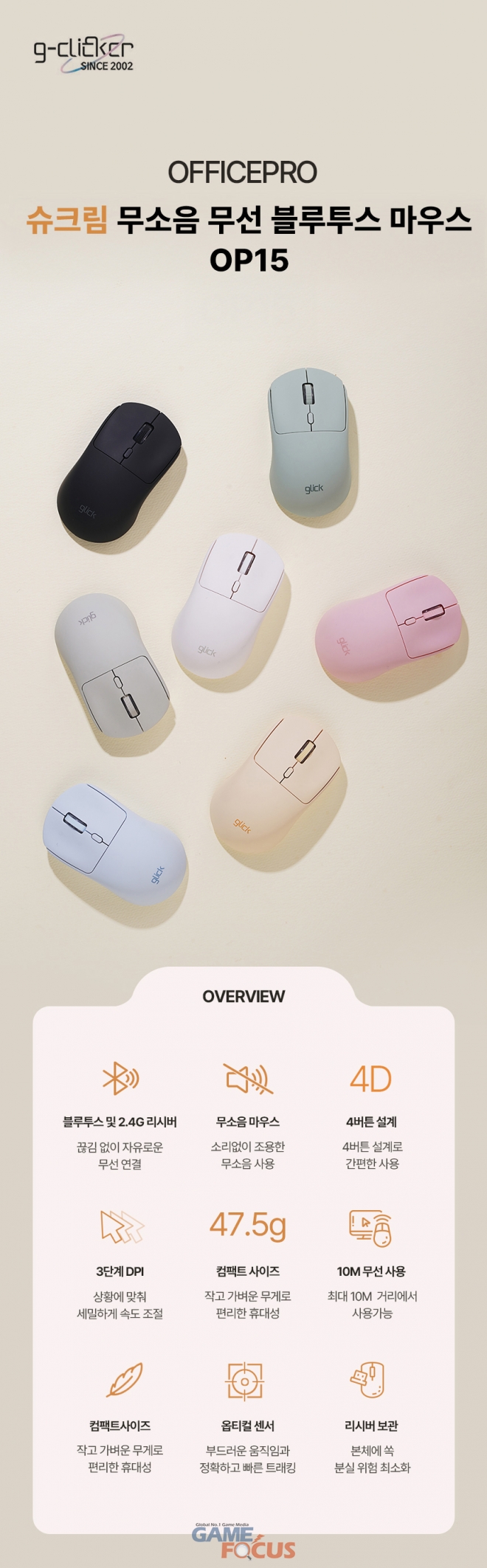 ‘OP15 슈크림’의 가장 큰 매력은 한 손에 쏙 들어오는 컴팩트한 사이즈와 47.5g이라는 놀라운 무게다. 장시간 사용 시 손목의 부담을 최소화함은 물론, 가방이나 파우치에 넣어 다니기 좋아 이동이 잦은 직장인과 학생들에게 최적화되었다. 또한, 제품명처럼 부드러운 7가지 파스텔톤 컬러로 출시되어 사용자의 취향에 맞는 폭넓은 선택권을 제공하며 세련된 데스크 환경을 연출한다.
