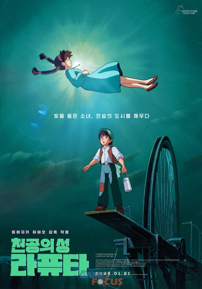 이번 재개봉과 함께 공개된 티저 포스터는 전설 속 공중도시 ‘라퓨타’의 모습을 담아 신비로운 분위기를 전한다. 짙은 푸른색의 하늘 위로 잊혀진 왕국의 모습이 드러난 가운데, “구름 속 공중 도시가 다시 떠오른다”라는 카피는 환상의 공간이자 신비로운 섬 ‘라퓨타’에 대한 궁금증을 자아내며 빛나는 목걸이를 목에 걸고 하늘에서 내려오는 ‘시타’를 바라보는 ‘파즈’의 모습을 담아 신비로움을 자아내는 메인포스터 역시 스크린에서 펼쳐질 클래식 명작에 대한 기대감을 증폭시킨다.