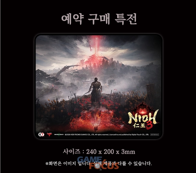 PlayStation®5 패키지판의 예약 특전으로 『Nioh 3』의 비주얼 키아트와 로고로 디자인 된 특제 마우스패드가 제공된다.