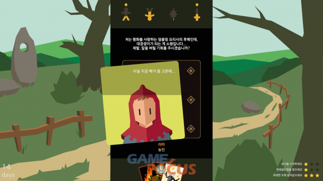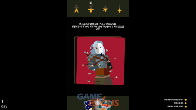 플레이어는 수천 가지에 달하는 내러티브 조합 속에서 게롤트의 전설을 직접 엮어 나가게 된다. 이야기 사이사이에는 전투 미니게임도 준비돼 있어, 구울이나 썩은마귀 같은 괴물들과의 전투를 카드 선택과 간단한 조작으로 즐길 수 있다. 현실과 허구가 뒤섞인 단델라이언식 이야기 속에서도, 위쳐의 검은 여전히 쉴 틈이 없다.