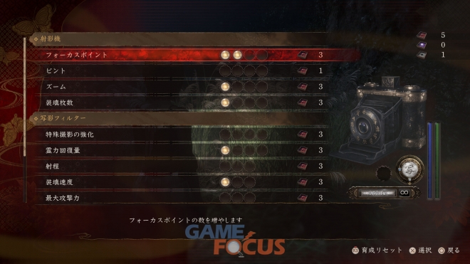 탐색 중 아이템 「염주」를 입수하는 경우가 있다. 「염주」를 사용하면 「사영기」 및 각 필터의 성능을 강화할 수 있다. 사영기 강화에는 포커스 포인트 수를 늘리거나 장전 속도를 빠르게 하는 등 다양한 강화가 가능하다.