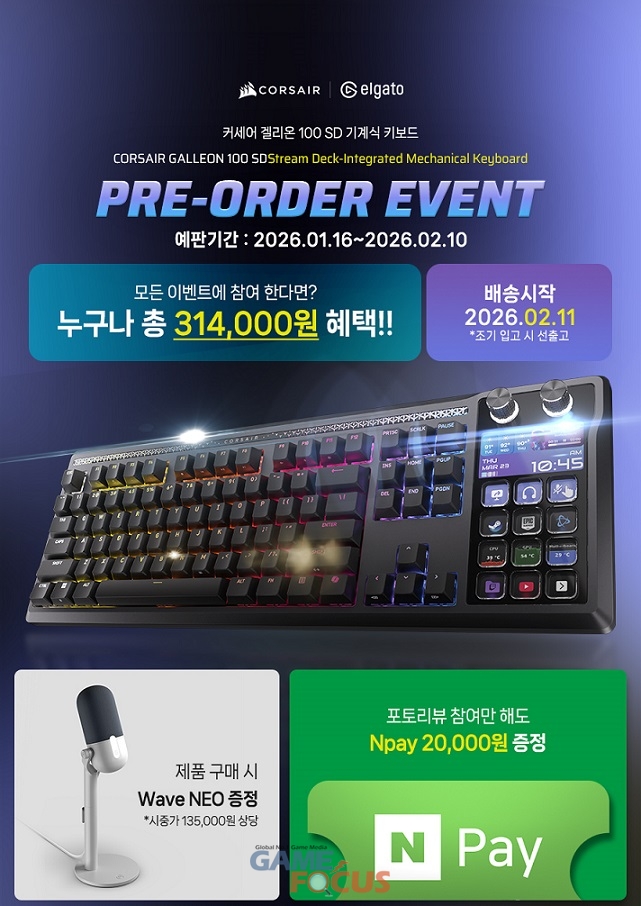 커세어는 ‘갤리온 100 SD’ 출시를 기념해 2026년 1월 16일부터 2월 10일까지 사전 구매 이벤트를 진행한다. 제품은 2026년 2월 11일부터 순차 발송되며, 조기 입고 시 선출고될 수 있다. 사전 구매 기간 중 제품 구매 고객에게는 시중가 135,000원 상당의‘엘가토 웨이브 네오(WAVE NEO)’ 마이크를 증정하며, 포토리뷰 참여 시 네이버페이 2만 원을 추가로 제공한다. 또한 구매 고객들 중 IT 커뮤니티인 퀘이사존, 쿨엔조이 또는 조드에 제품 관련 리뷰를 올린 후 QR 인증을 완료하면 시중가 159,000원 상당의 커세어 ‘VOID v2 헤드셋’을 증정한다. 더 자세한 내용은 커세어 네이버 스마트스토어에서 확인할 수 있다.