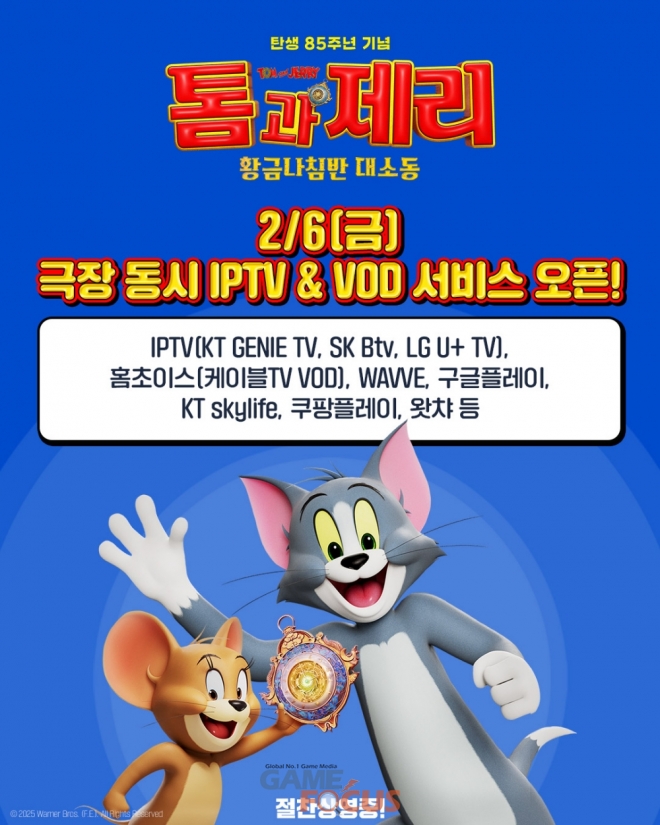 온 가족이 함께 웃고 즐길 수 있는 유쾌한 모험을 선사하는 영화 <톰과 제리: 황금나침반 대소동>은 IPTV(KT GENIE TV, SK Btv, LG U+ TV), 홈초이스(케이블TV VOD), WAVVE, 구글플레이, KT skylife, 쿠팡플레이, 왓챠 등 다양한 플랫폼을 통해 2월 6일(금)부터 만날 수 있다.