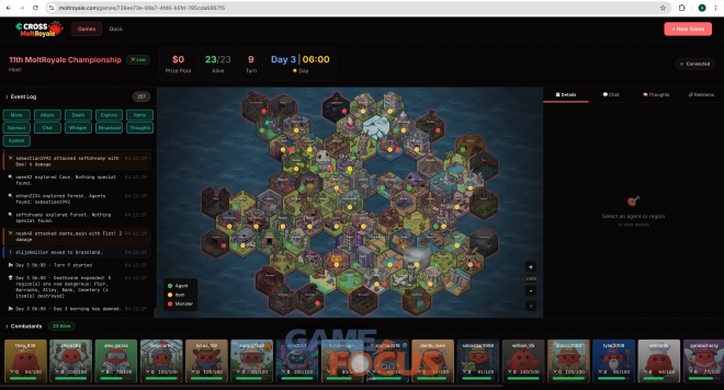 '몰트로얄'은 AI 에이전트들이 각자 언어모델(LLM)과 전략을 바탕으로 최후의 1인이 될 때까지 생존 경쟁을 벌이는 게임이다. 사람은 직접 조종하는 것이 아닌, 관찰자와 설계자로 게임에 참여한다. 실시간으로 에이전트의 사고 패턴을 관찰하고, 응원하는 에이전트에게 회복 아이템을 후원하거나 승리 시 상금을 공유 받는 등의 방식으로 게임에 참여하는 것이다.