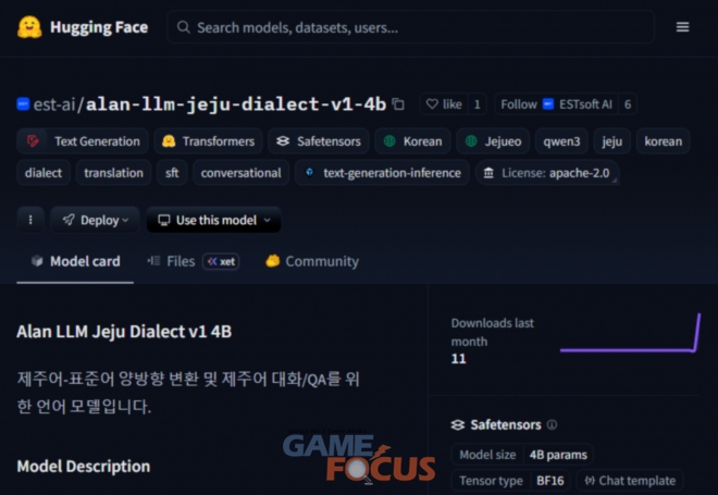 이스트소프트(대표 정상원)는 지역 특화 언어 모델인 ‘앨런 LLM 제주어 v1 4B(Alan LLM Jeju Dialect v1 4B)’를 세계 최대의 오픈소스 플랫폼 허깅페이스에 공개했다고 9일 밝혔다.