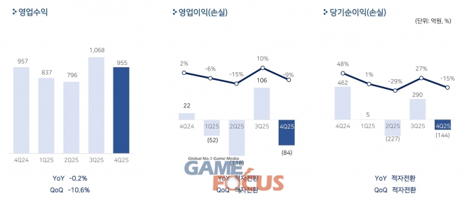 (주)펄어비스가 12일 실적발표를 통해 2025년 연결 기준 4분기 매출 955억원, 영업손실 84억원, 당기순손실 144억원을 기록했다고 밝혔다.
