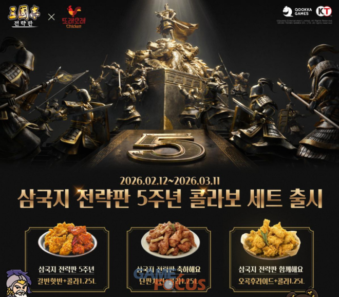 한편 ‘삼국지 전략판’은 서비스 기간 동안 주년 시즌마다 이용자 참여형 이벤트와 브랜드 협업을 통해 다양한 기념 콘텐츠를 선보여왔으며, 이번 5주년 역시 온·오프라인을 연계한 형태로 운영된다. 공식 카페를 통해서도 또래오래 치킨 세트 및 할인 쿠폰을 제공하는 이벤트가 함께 진행 중이다.