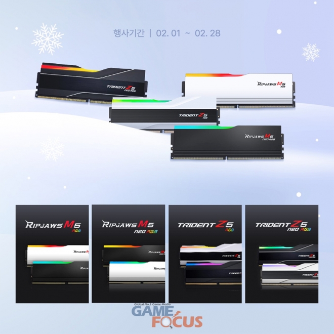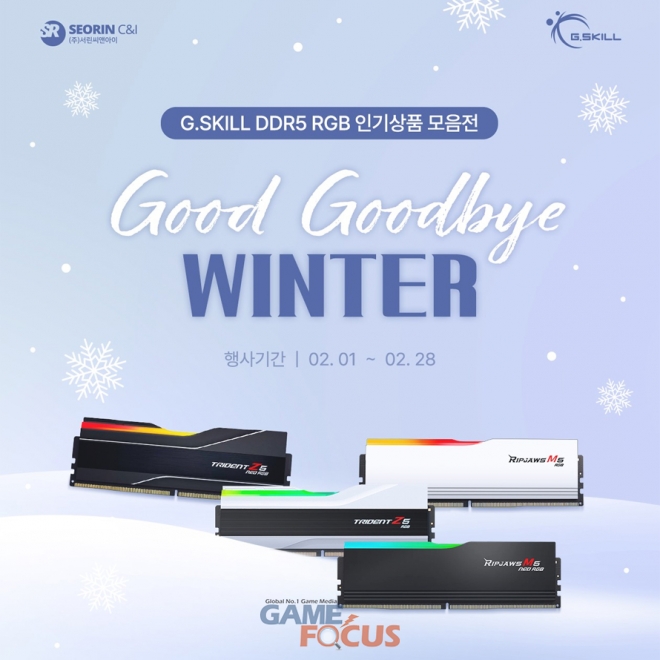 서린씨앤아이 (대표: 전덕규)가 IT 전문 쇼핑몰 컴퓨존과 함께 G.SKILL의 RGB 메모리 인기상품 모음전을 진행한다고 밝혔다. 이번 행사는 Good Goodbye WINTER 라는 타이틀로 진행되며 2월 1일부터 2월 28일까지 한달 간 운영된다. 모음전은 RIPZAWS M5와 TRIDENT Z5 등의 RGB RAM 모델을 앞세운 라인업으로 마련됐다.