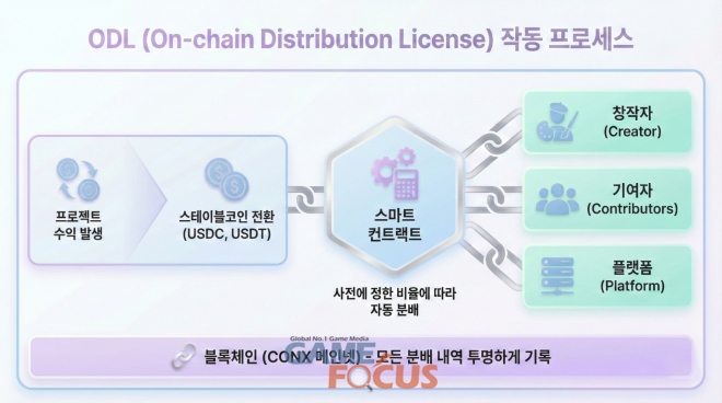 컴투스홀딩스는 CONX가 추진하는 ‘순환형 RWA’ 기반 프로젝트인 ‘CONX 아레나’에 자체 개발한 웹3 자동 분배 규격 ODL을 적용했다. ODL은 참여자들이 사전에 협의한 비율에 따라 수익을 자동으로 분배받을 수 있도록 설계된 스마트 컨트랙트 기술로, 모든 분배 내역은 블록체인에 기록돼 투명하게 관리된다. 특히, USDC, USDT 등 가격 변동성이 적은 스테이블코인으로 수익을 분배해 안정성을 높인 것이 특징이다.