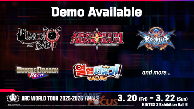 '아크 월드 투어 2025-2026 파이널' 이벤트 현장 내 아크시스템웍스 타이틀 체험 부스에서는 지난 타이베이 게임쇼 2026에서 최초 공개된 ‘열혈 시리즈’ 신작, '열혈서유기 천축난투편', 그리고 3월 26일 출시를 앞둔 '데이먼 앤 베이비' 등 아크시스템웍스의 최신 타이틀을 출시에 앞서 먼저 체험해볼 수 있다. 또한 절찬 판매 중인 '더블 드래곤 리바이브'와 '압솔룸', '블레이블루 센트럴픽션'과 같은 인기 타이틀을 현장에서 플레이할 수 있다.