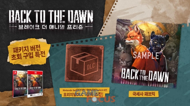 Nintendo Switch™, Nintendo Switch™ 2 『Back to the Dawn ~브레이크 더 애니멀 프리즌~』 패키지 제품의 예약 판매는 ‘일반판’과 호화 아이템을 오리지널 신규 일러스트 BOX와 함께 제공하는 ‘LIMITED EDITION’으로 각각 나누어 진행된다. 또한 패키지 제품을 구입할 경우 실물 초회특전으로 본작의 메인 비주얼을 사용한 ‘극세사 패브릭’과 오리지널 DLC ‘감옥 스킨’을 수령할 수 있다.