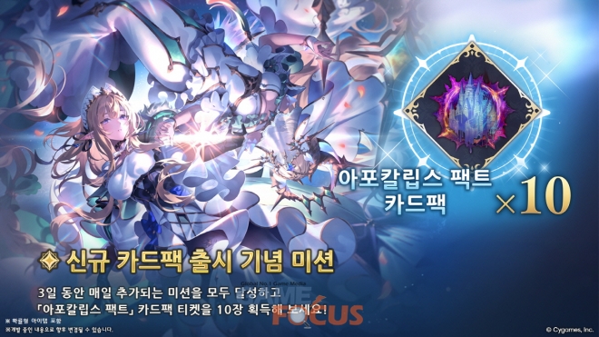 최초 로그인한 날부터 3일 동안 매일 추가되는 미션을 클리어하면 아포칼립스 팩트 카드팩 티켓을 총 10장 획득할 수 있다.