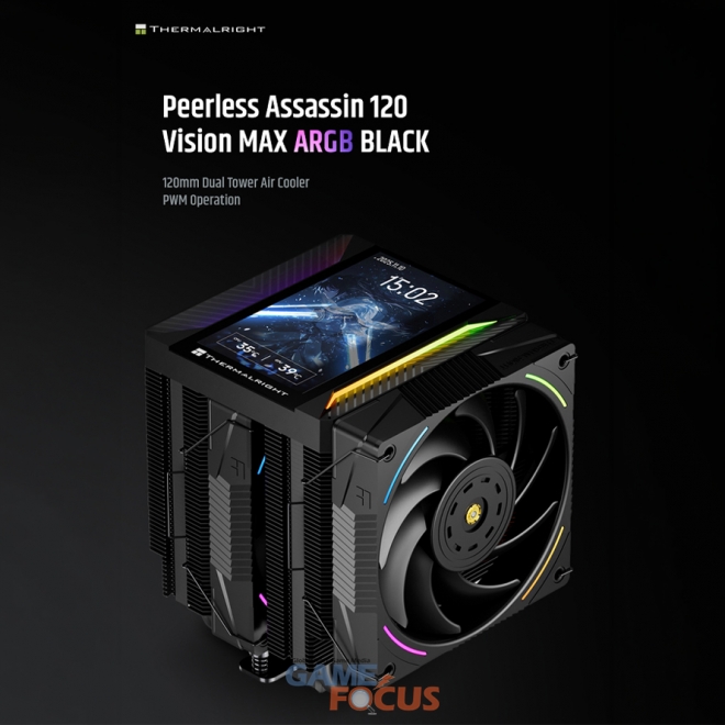 피어리스 어쌔신 120 비전 맥스 ARGB는 써멀라이트의 베스트셀러인 피어리스 어쌔신 시리즈의 기술력에 사용자 편의성을 더한 상단 5인치 LCD 모니터를 결합한 모델이다. 제품 상단의 디스플레이를 통해 CPU 온도, 사용률, 클럭 등 핵심 시스템 정보를 실시간으로 확인할 수 있으며, 전용 소프트웨어인 TRCC(Thermalright Control Center)를 사용해 원하는 이미지나 영상을 출력하는 등 개인화된 시스템 연출이 가능하다.