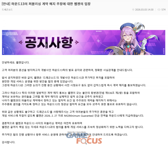 하운드13은 2월 13일, 웹젠의 MG 잔금 미지급을 이유로 '드래곤소드'의 퍼블리셔인 웹젠과의 퍼블리싱 계약을 해지한다고 통보했다. 웹젠이 MG 잔금을 지급하지 않았고 게임의 흥행에 큰 영향을 주는 마케팅 역시 충분하지 않았다고 주장했다. 반면 이에 대해 웹젠은 여러 상황을 종합 검토한 결과 MG 잔금을 지급하더라도 안정적인 서비스를 유지하기 어려울 수 있다고 판단, 1년 간의 운영 자금에 대한 추가 투자를 제안했다고 반박했다.