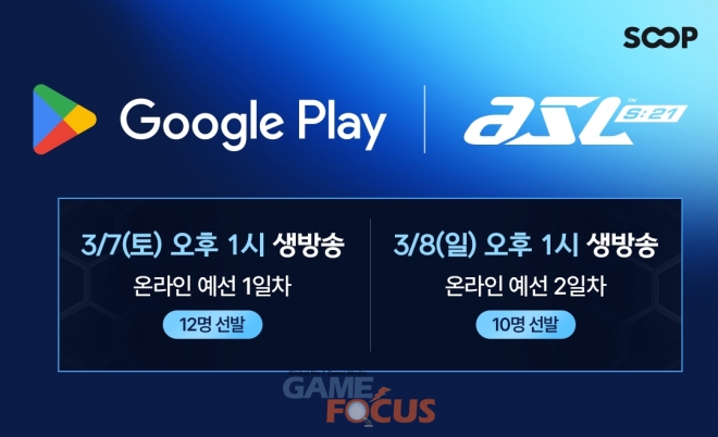 SOOP(각자 대표이사 서수길, 최영우)은 블리자드 엔터테인먼트의 실시간 전략(RTS) 게임 ‘스타크래프트: 리마스터(StarCraft®: Remastered)’로 진행되는 ‘ASL 시즌21’ 예선을 오는 3월 7일(토)과 8일(일) 양일간 오후 1시부터 온라인으로 진행한다. 지난 시즌에 이어 이번 시즌에도 구글플레이(Google Play)가 공식 스폰서로 참여한다.