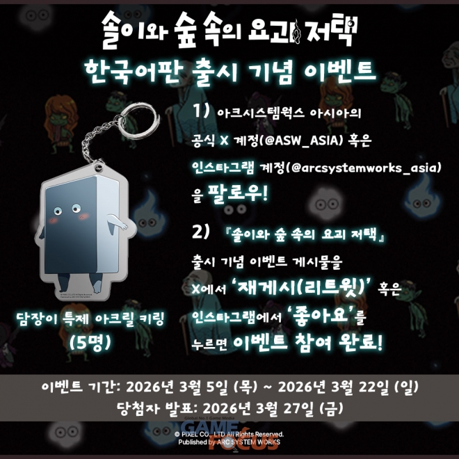 2. 『솔이와 숲 속의 요괴 저택』 한국어판의 출시 기념 이벤트 게시물을 X에서 ‘재게시(리트윗)’, 혹은 인스타그램에서 이벤트 게시물에 ‘좋아요’를 누르면 이벤트 참여 완료