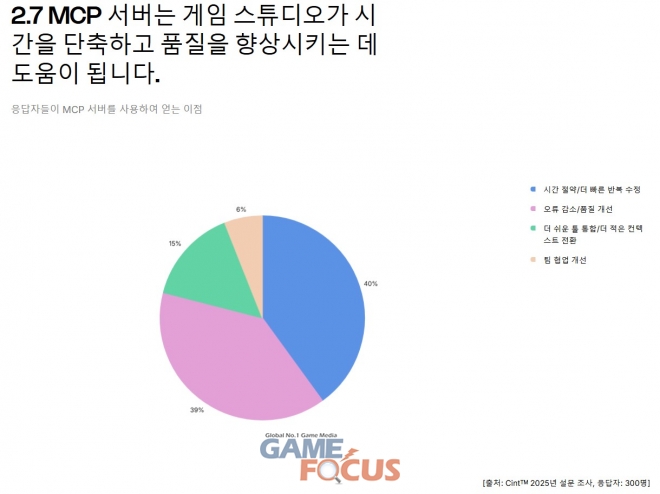설문에 참여한 스튜디오의 50%는 MCP(모델 컨텍스트 프로토콜) 서버를 활용하고 있다고 답했다. MCP 서버를 사용하는 스튜디오 가운데 90%는 게임 엔진 및 에디터에 연결할 목적으로 MCP를 사용했다. 이는 반복 작업을 자동화하는 데 도움이 되며 강력한 디버깅 및 테스트 기능을 제공한다. MCP 서버 도입 후 ‘시간 절약 및 더 빠른 반복 수정(40%)’을 가장 큰 이점으로 평가했고, 39%는 오류 감소와 결과물의 품질 개선을 경험했다고 응답했다.