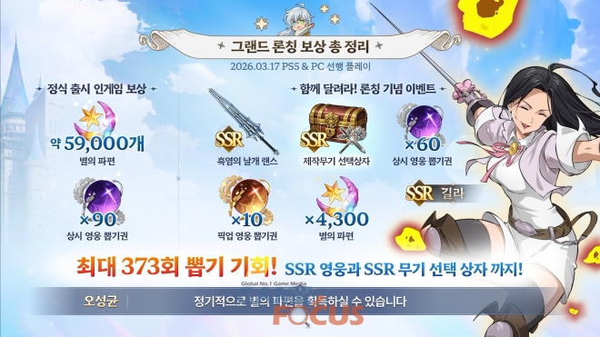 정식 출시를 기념해, 접속만 해도 SSR 영웅 '길라'와 SSR 무기를 제공하며, 각종 이벤트와 게임 플레이를 통해 최대 373회 수준의 소환 기회를 얻을 수 있다