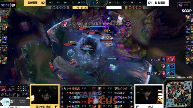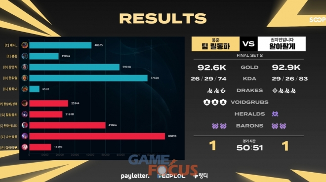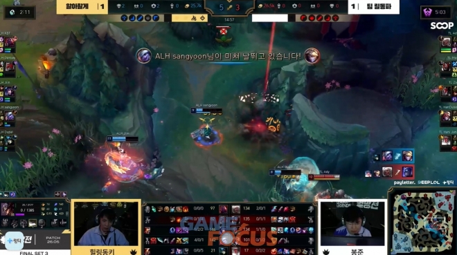 승부는 두 번째 바론 타이밍을 앞두고 벌어진 한타에서 결정됐다. 정글과 미드의 존재감 차이를 보여주며 한타에서 대승한 알아할게는 한타에서 승리하고 바론을 바로 차지한 이후 그대로 상대 넥서스를 밀어내며 1세트 승리의 주인공이 됐다.