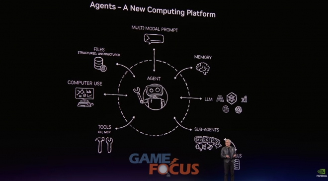 이어 젠슨 황 CEO가 관중들의 열렬한 박수 속에 무대에 올랐다. 그는 행사 전 진행된 프리게임 쇼 진행자들에게 감사를 표하고, 이번 행사에 참여한 파트너사들과 450여 곳의 후원사, 1,000여 개의 세션, 2,000여 명의 연사들을 소개했다. 이후 “이번 콘퍼런스는 AI라는 5단 케이크의 모든 층을 아우를 것”이라고 말하며 기조연설을 시작했다.