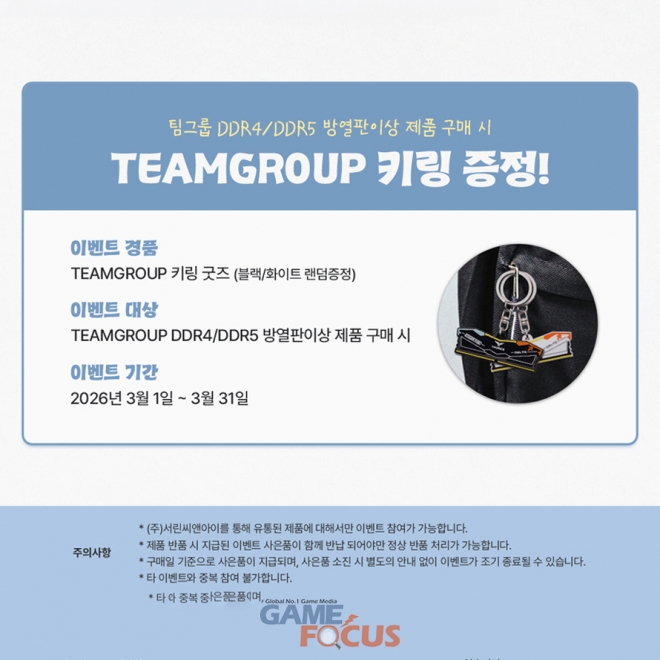 본 프로모션은 2026년 3월 1일부터 3월 31일까지 한 달간 진행된다. 행사 적용 대상은 팀그룹 라인업 중 방열판이 장착된 DDR4 및 DDR5 규격의 모든 PC 메모리 제품이다. 해당 조건을 충족하는 방열판 탑재 메모리 제품 구매 시 팀그룹 전용 키링이 사은품으로 함께 지급된다.