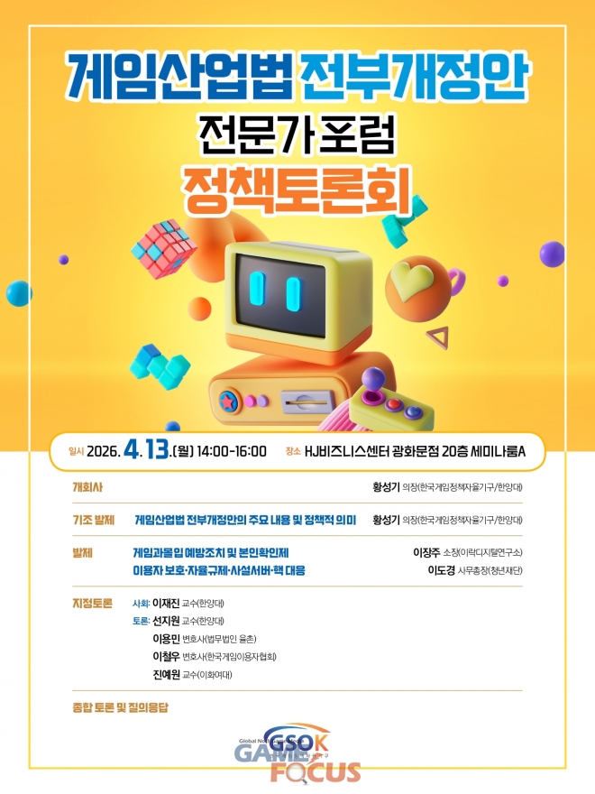 이와 함께 오는 4월 13일(월), HJ비즈니스센터에서 게임산업법 전부개정안 전문가포럼 정책토론회를 개최하여 전부개정안의 주요 쟁점에 대한 전문가의 의견을 공유하고 각계의 다양한 의견을 수렴할 예정이다.