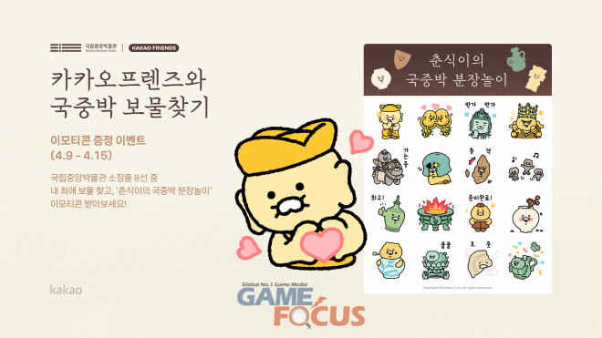 먼저, 4월 9일 오후 12시부터 15일까지 '춘식이의 국중박 분장놀이' 이모티콘 증정 이벤트를 진행한다. 국립중앙박물관이 소장한 유물 8선 중 자신의 취향에 맞는 보물을 선택하는 이벤트로, 참여자에게는 보물 24종으로 분장한 춘식이의 모습이 담긴 무료 이모티콘을 증정한다. 이어서 4월 16일부터는 해당 이모티콘을 유료로 판매하고 판매 수익금의 일부를 국립중앙박물관회에 기부할 계획이다. 자세한 내용은 카카오프렌즈 공식 인스타그램 계정(@ryan.seoul.icon)을 통해 확인할 수 있다.