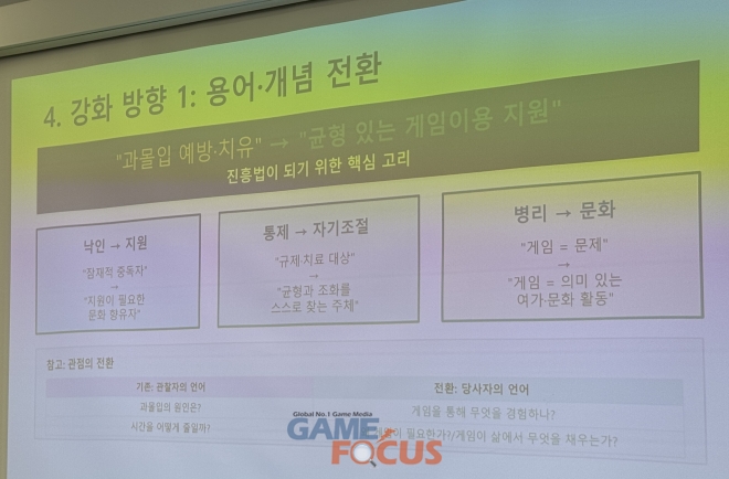 이에 이 소장은 과몰입 예방, 과몰입 치유를 ‘균형 있는 게임이용 지원’으로 용어와 개념을 전환하는 것을 제언했으며, ▲낙인(잠재적 중독자)->지원(지원이 필요한 문화 향유자) ▲통제(규제 및 치료 대상)->자기조절(균형과 조화를 스스로 찾는 주체) ▲병리(게임 = 문제)->문화(게임=의미 있는 여가 및 문화 활동) 등으로 관점을 바꿔야함을 강조했다.