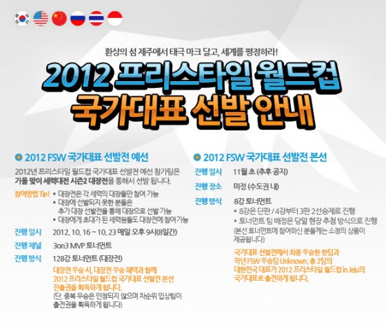 올해로 4회째를 맞이하는 이번 한국 대표 선발전은 온라인 예선과 오프라인 본선으로 진행되며 최종 우승팀에게는 한국 대표로 '2012 FSW'에 참가할 수 있는 자격이 주어진다.