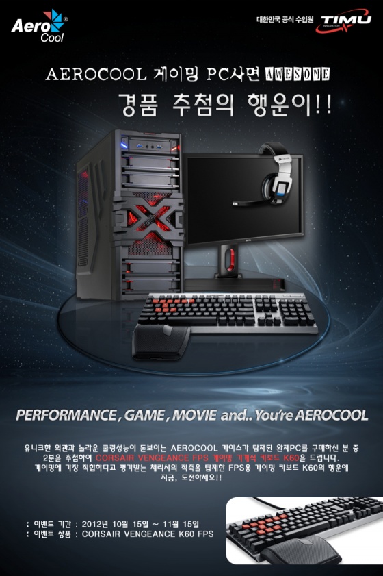이번 이벤트는 이노베이션티뮤가 국내 유통을 담당하는 게이밍 PC 케이스 전문 기업, Aerocool (에어로쿨)의 PC케이스가 적용된 게이밍 완제 PC를 구매하는 유저들을 대상으로 추첨을 통해 CORSAIR (커세어)의 고급 게이밍기어 시리즈 중 하나인, 'VENGEANCE (벤젼스) K60'을 경품으로 총 2명에게 증정한다.